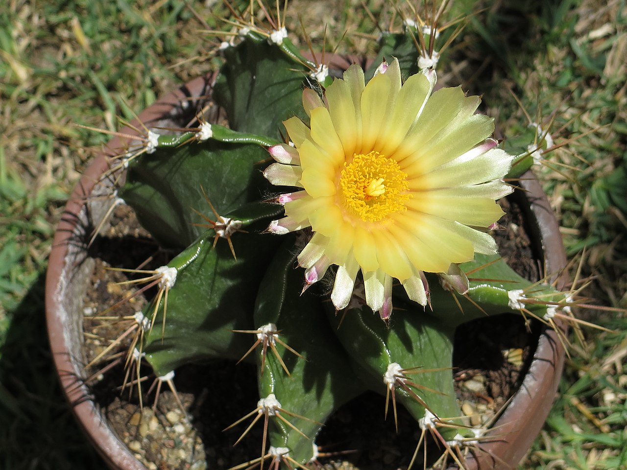 Mas o cacto astrophytum ornatum também apresenta bastante pontos brancos. E as flores são belíssimas, grande e amarelas. Mas a floração ocorre normalmente no verão e após quase 8 anos!