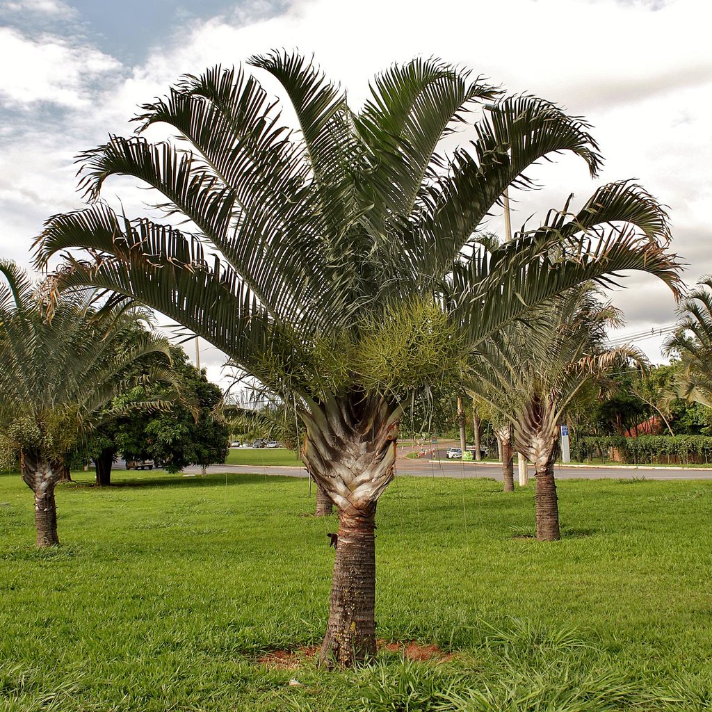 Mas as folhas desta palmeira são arqueadas, com uma coloração azulada, pinadas e bem grandes. E essa planta tem o crescimento lento e o seu caule pode atingir quase 40 centímetros de diâmetro. Só que as flores são bem delicadas, pequenas e com uma cor amarela.