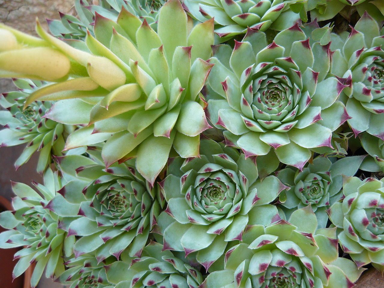 Mas essa suculenta é de pequeno porte. Ou seja, atinge uma altura máxima de 15 centímetros. E a mesma forma lindas rosetas compactas e aglomeradas. Mas as folhas desta suculenta são de cor verde, suculenta e com as pontas avermelhadas.